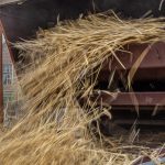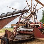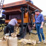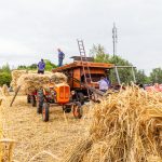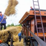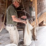 Het teveel aan graan wordt tijdens de oogstdag ter plaatse in een oude dorsmolen verwerkt en gezuiverd in een kafmolen.